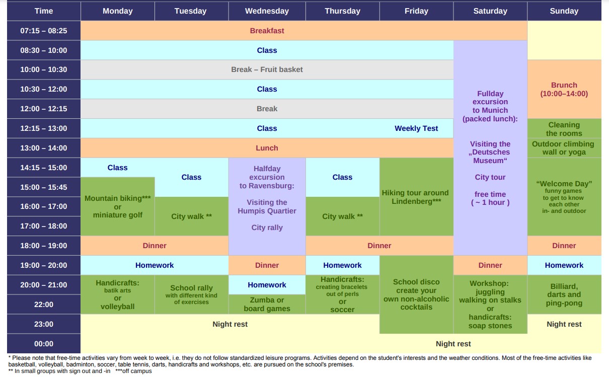 rezydencja, 2–4-osobowy, pełne wyżywienie */?/Studenci mieszkają na terenie kampusu. Dostępne są ładnie wyposażone pokoje 2-, 3- i 4-osobowe, z których większość ma piękny widok na Alpy lub pobliski las. Wszystkie pokoje z łazienkami en-suite. W trakcie obozu gwarantowane pełne wyżywienie (śniadanie, obiad, kolacja), pościel i ręczniki (wymieniane raz w tygodniu) oraz możliwość prania. Studenci kwaterowani są ze sobą pod względem wieku, płci, narodowości (różnorodność w pokoju) oraz poziomu znajomości języka.